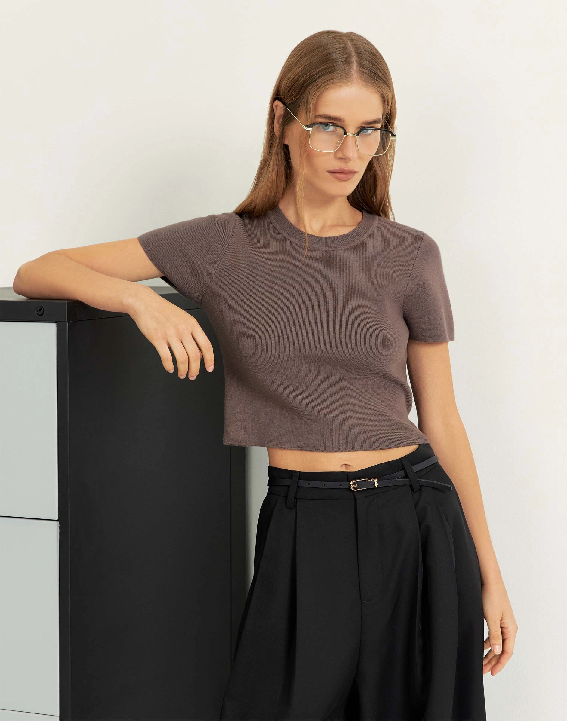 Коричневый укороченный джемпер с короткими рукавами Gsw007727-1