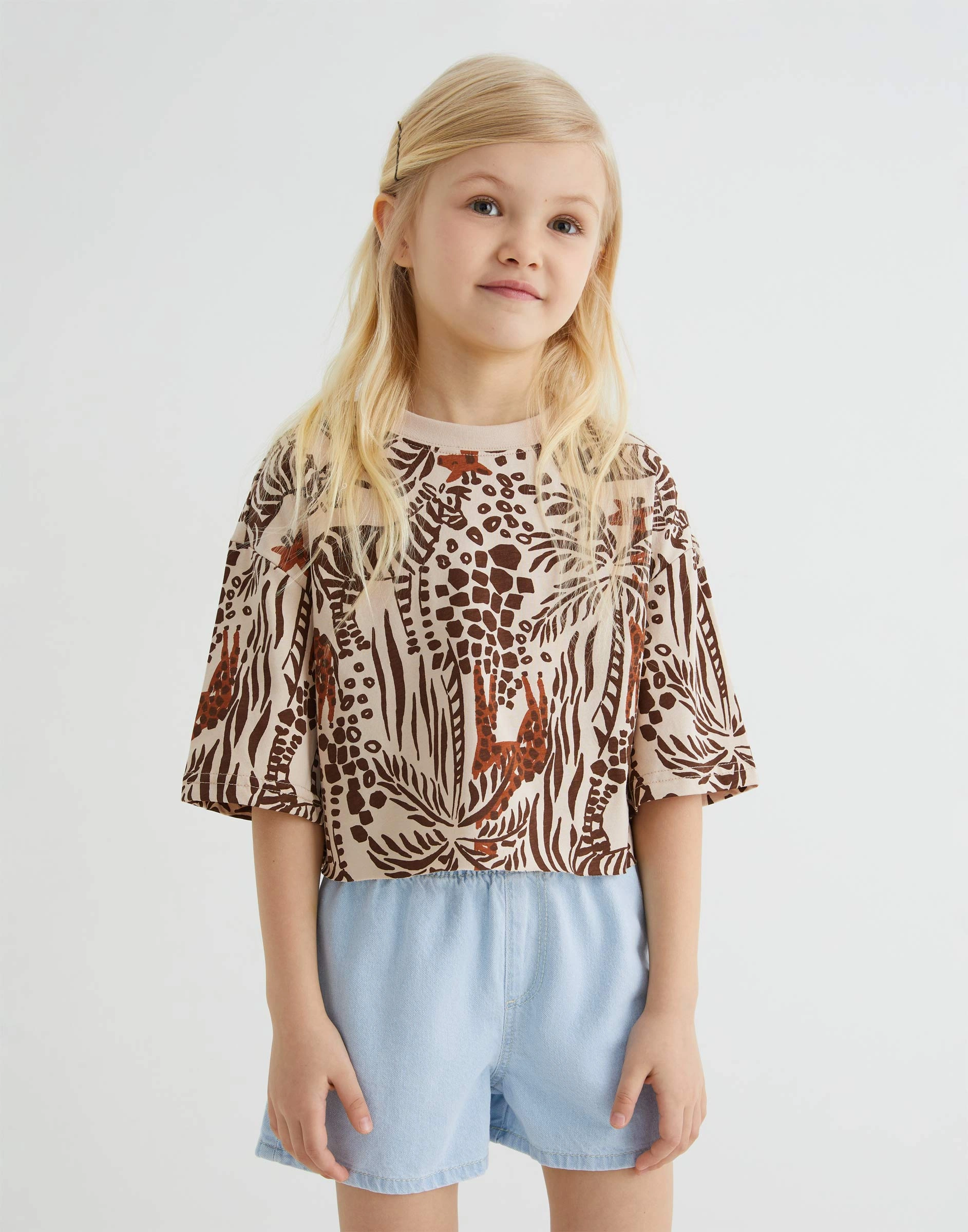 Бежевая укороченная футболка oversize с принтом для девочки Gkt026796-1