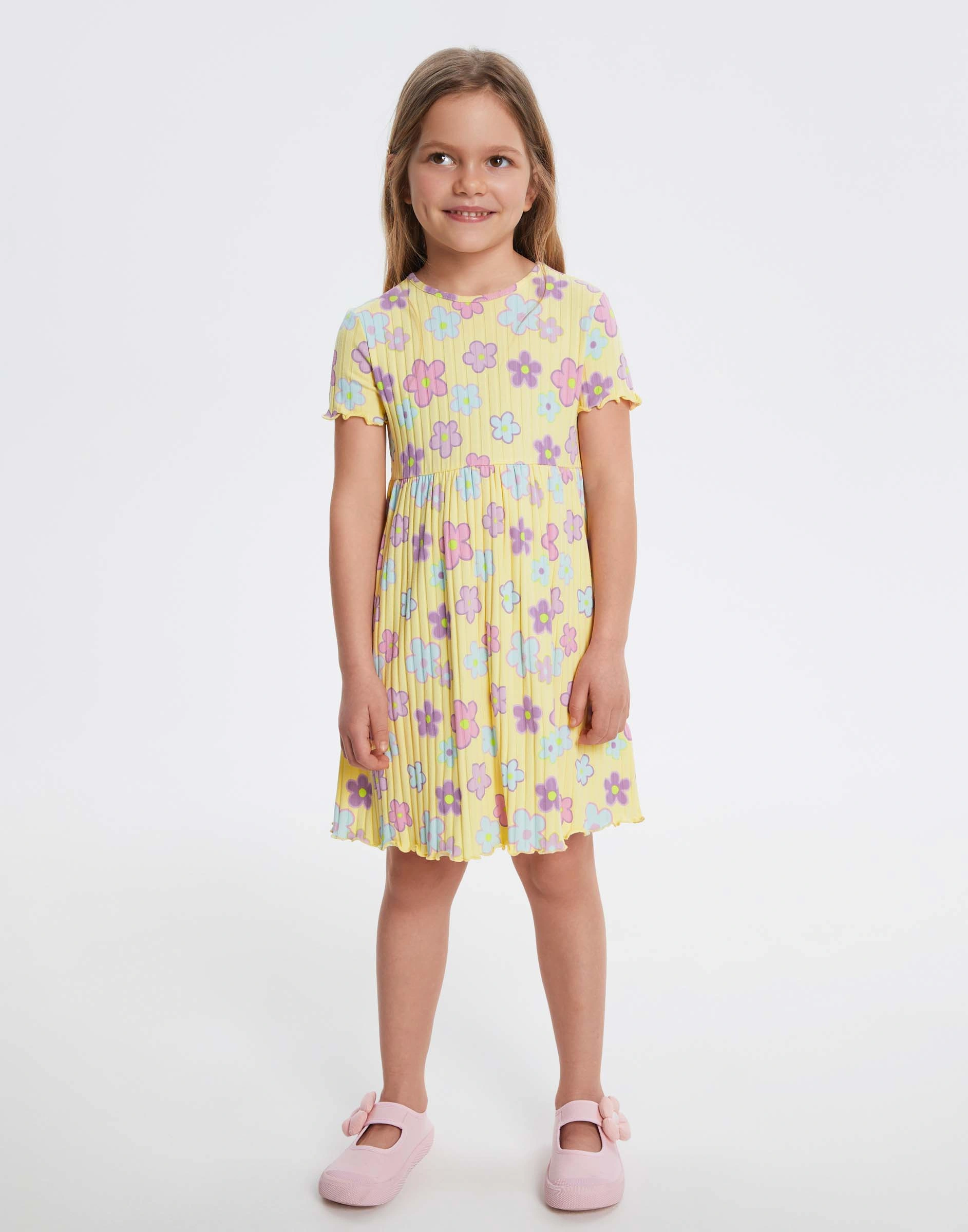 Жёлтое расклёшенное платье в рубчик с принтом для девочки Gdr030089-3