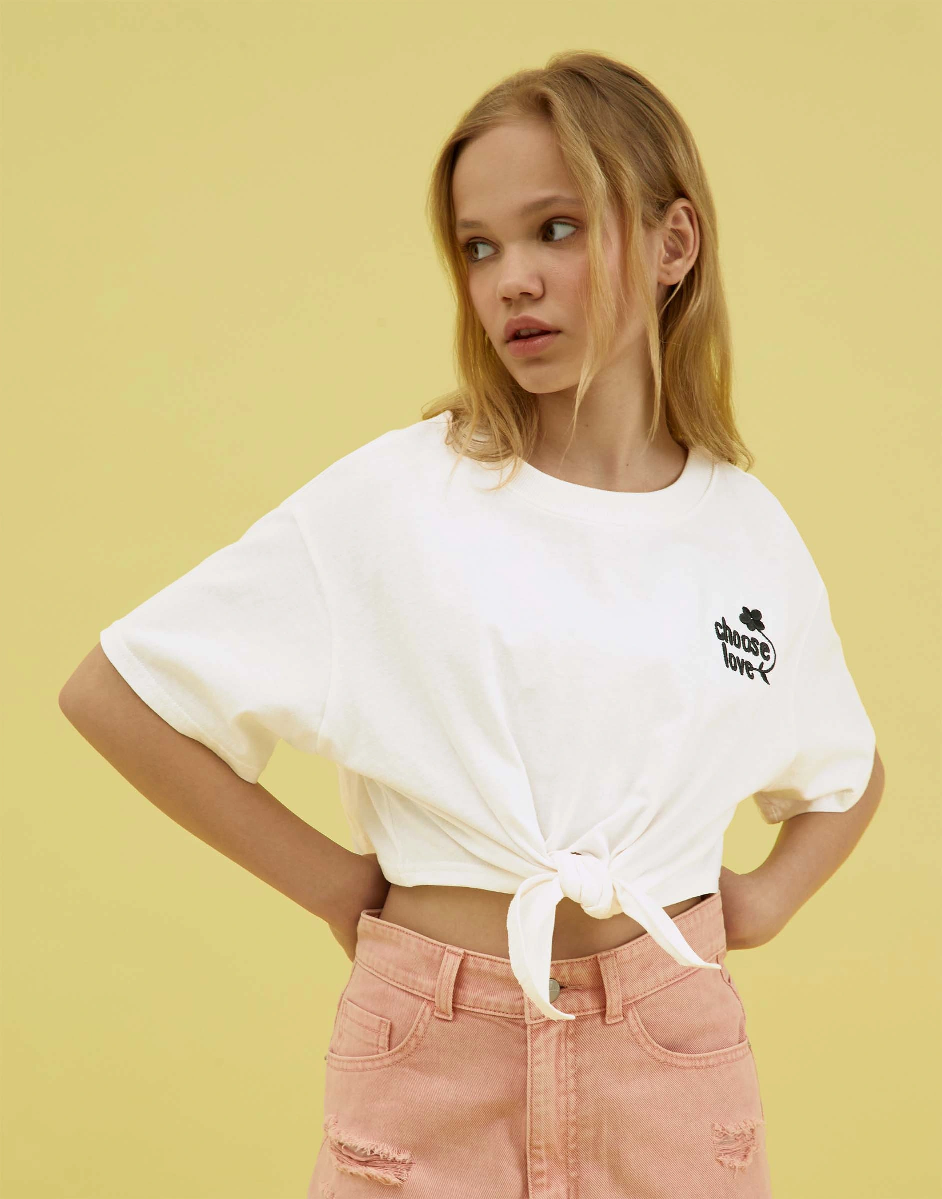 Молочная укороченная футболка oversize с вышивкой и узлом Gkt026783-2