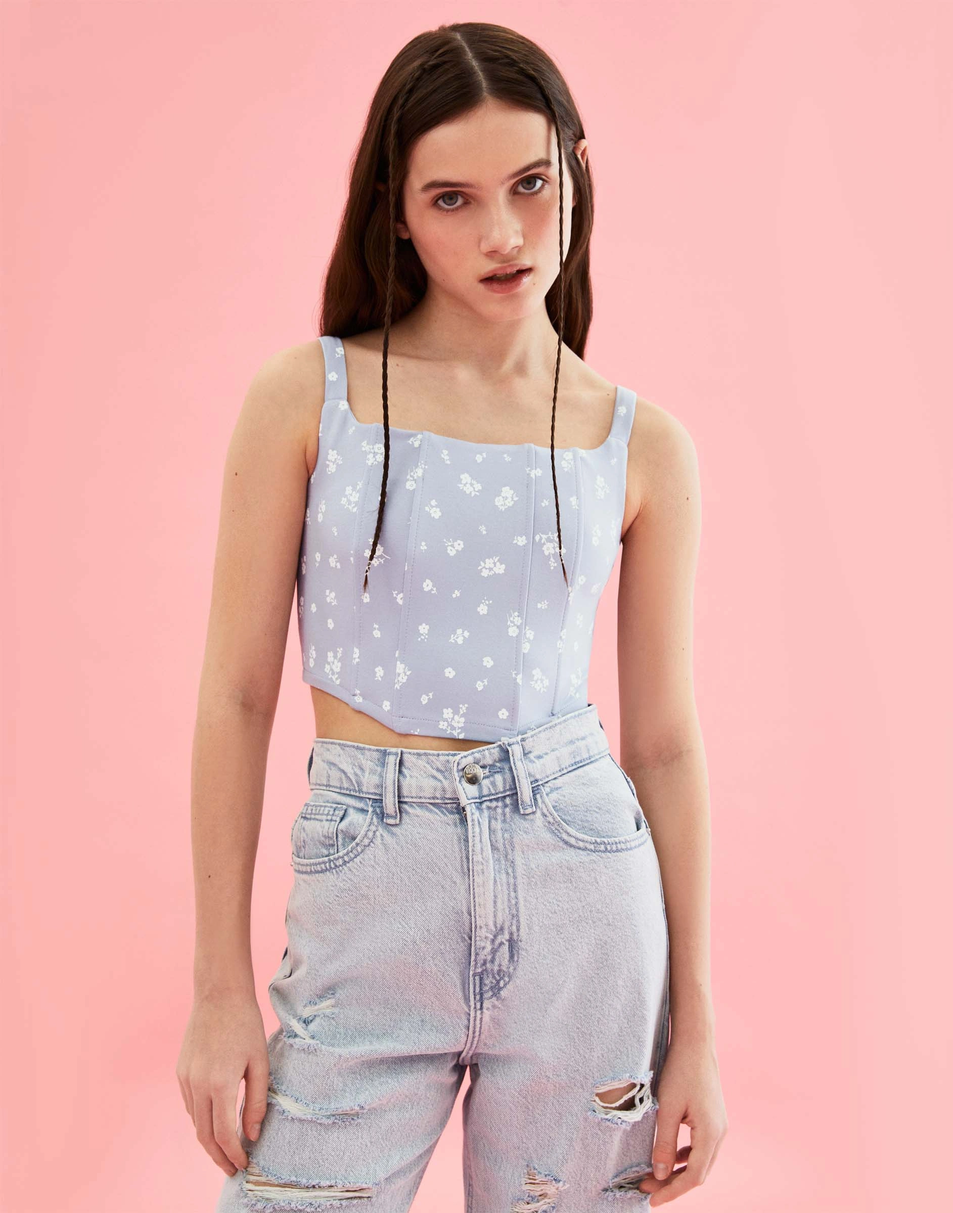 Синий корсетный кроп-топ с принтом и фигурным низом Gtn004427-2