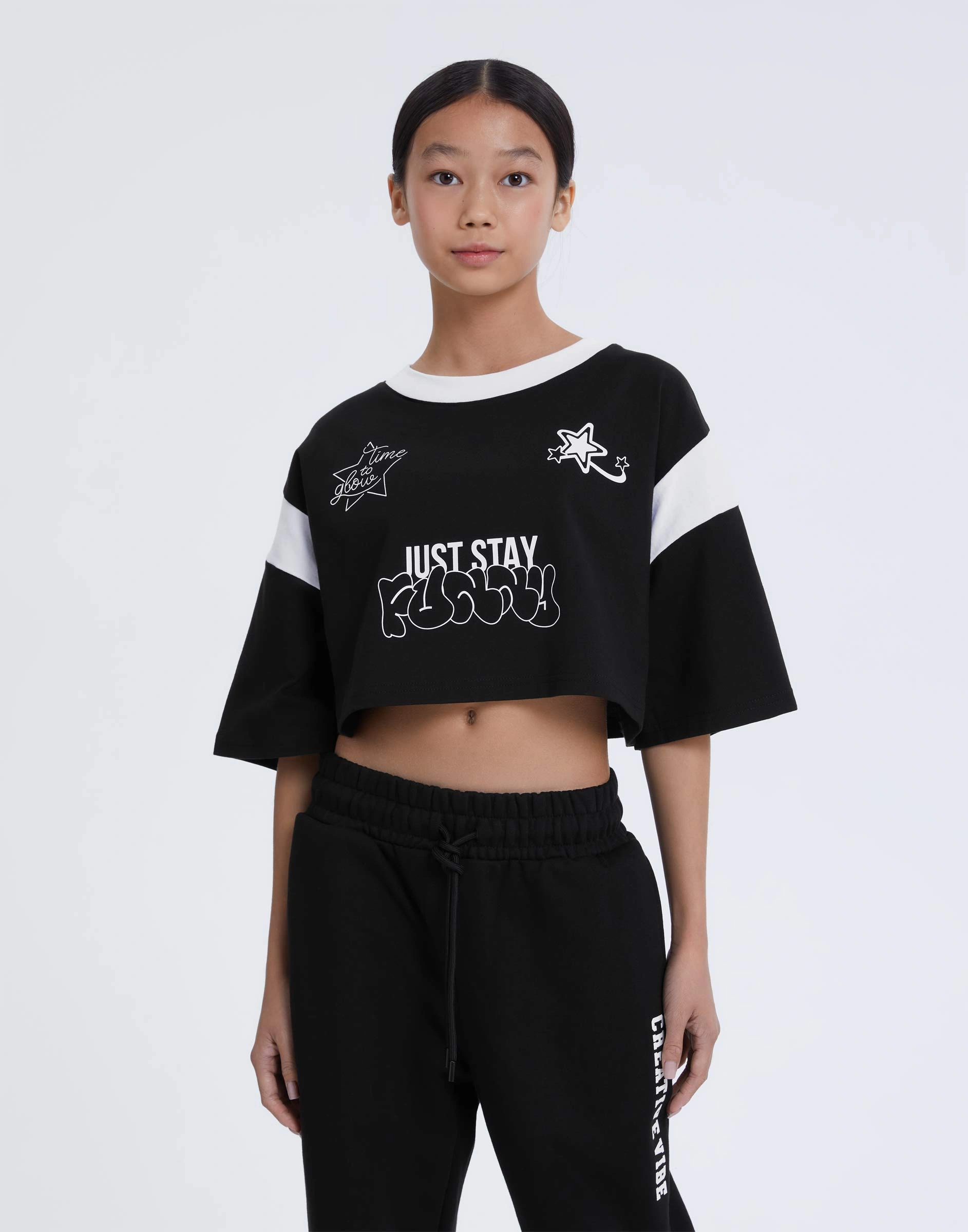 Чёрная укороченная футболка oversize с принтом Gkt025633-1