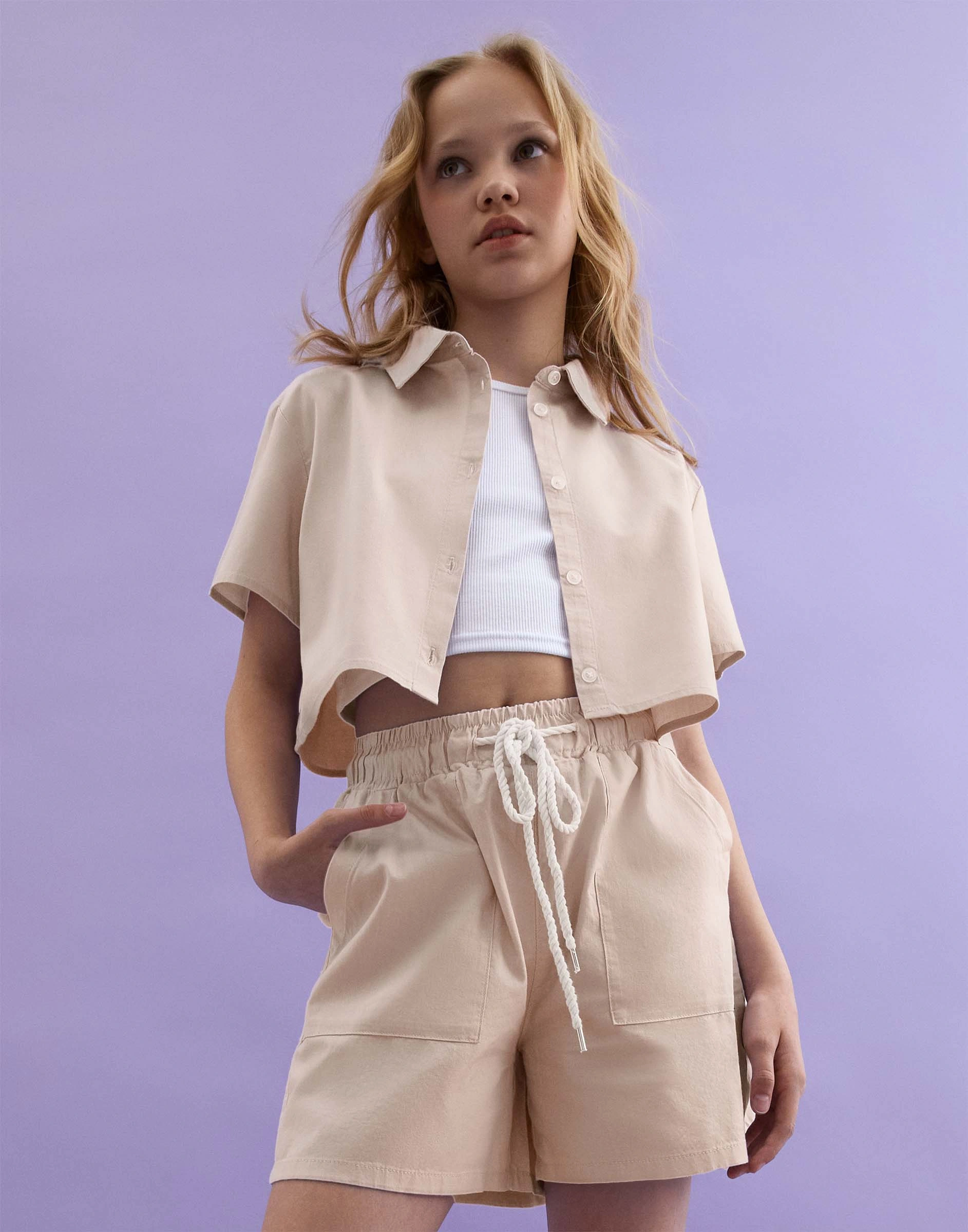Бежевая рубашка Straight с коротким рукавом Gwt004842-1