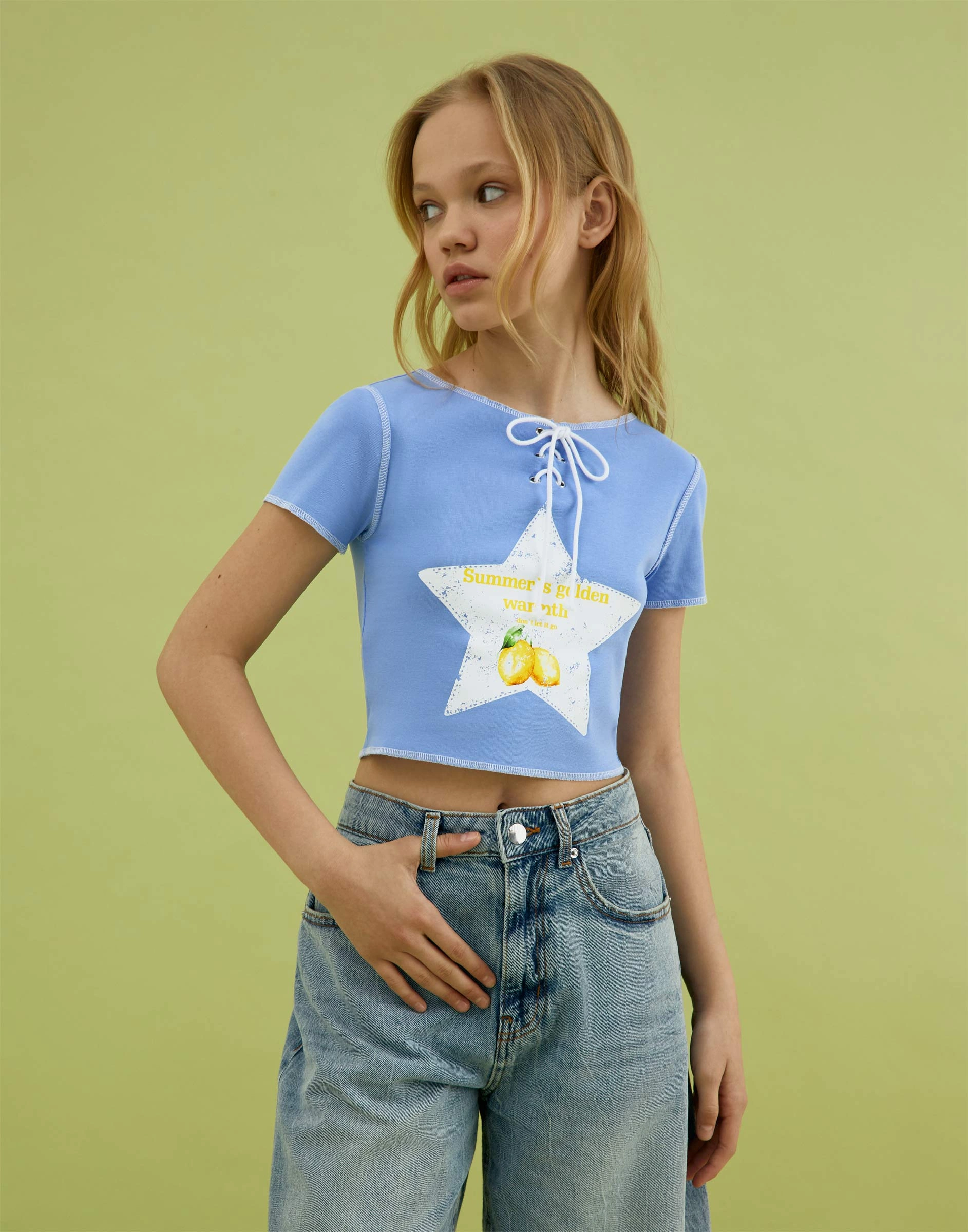 Голубая укороченная футболка в рубчик с принтом и шнуровкой Gkt026786-1