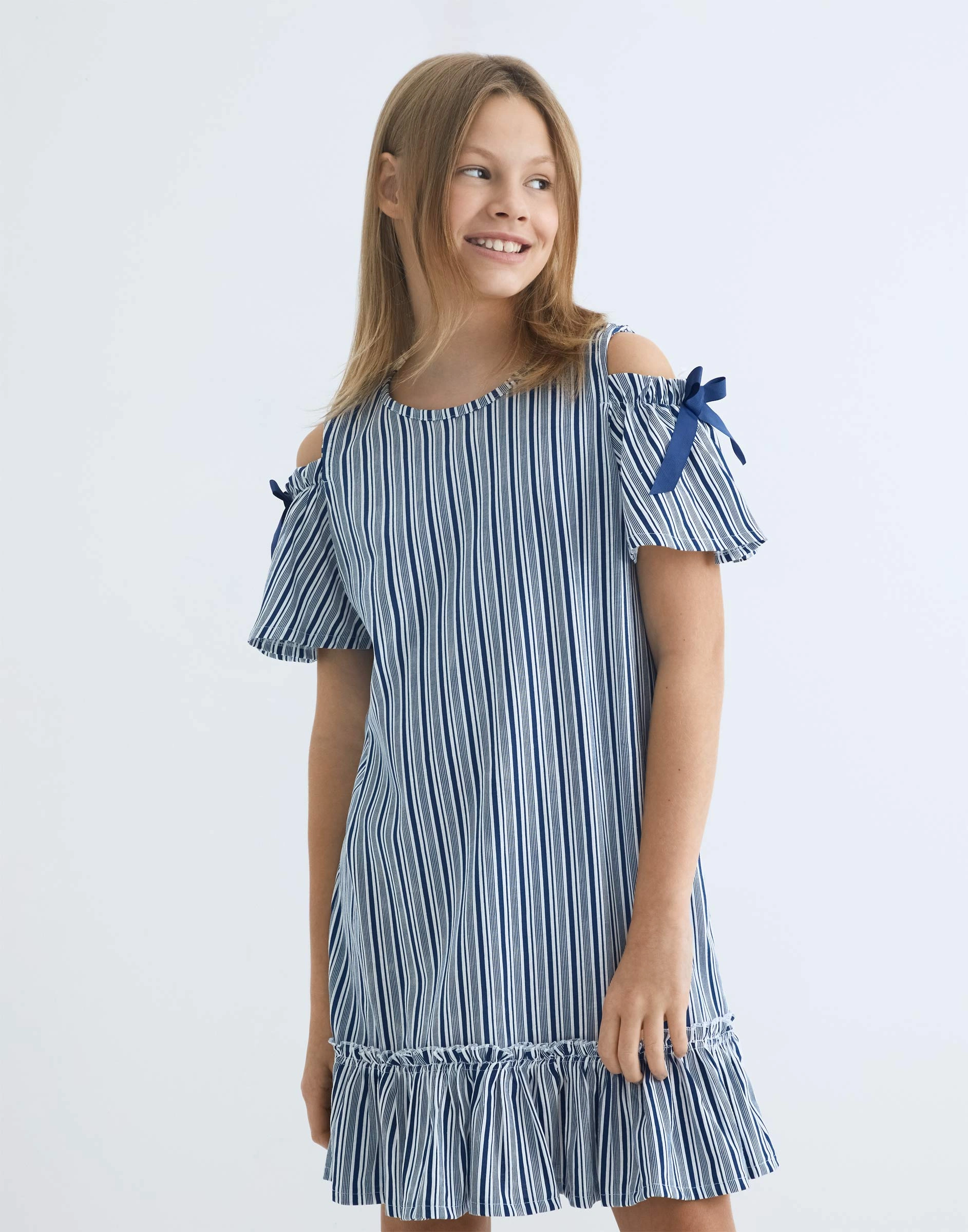 Полосатое платье с открытыми плечами, бантами и оборкой Gdr030031-2