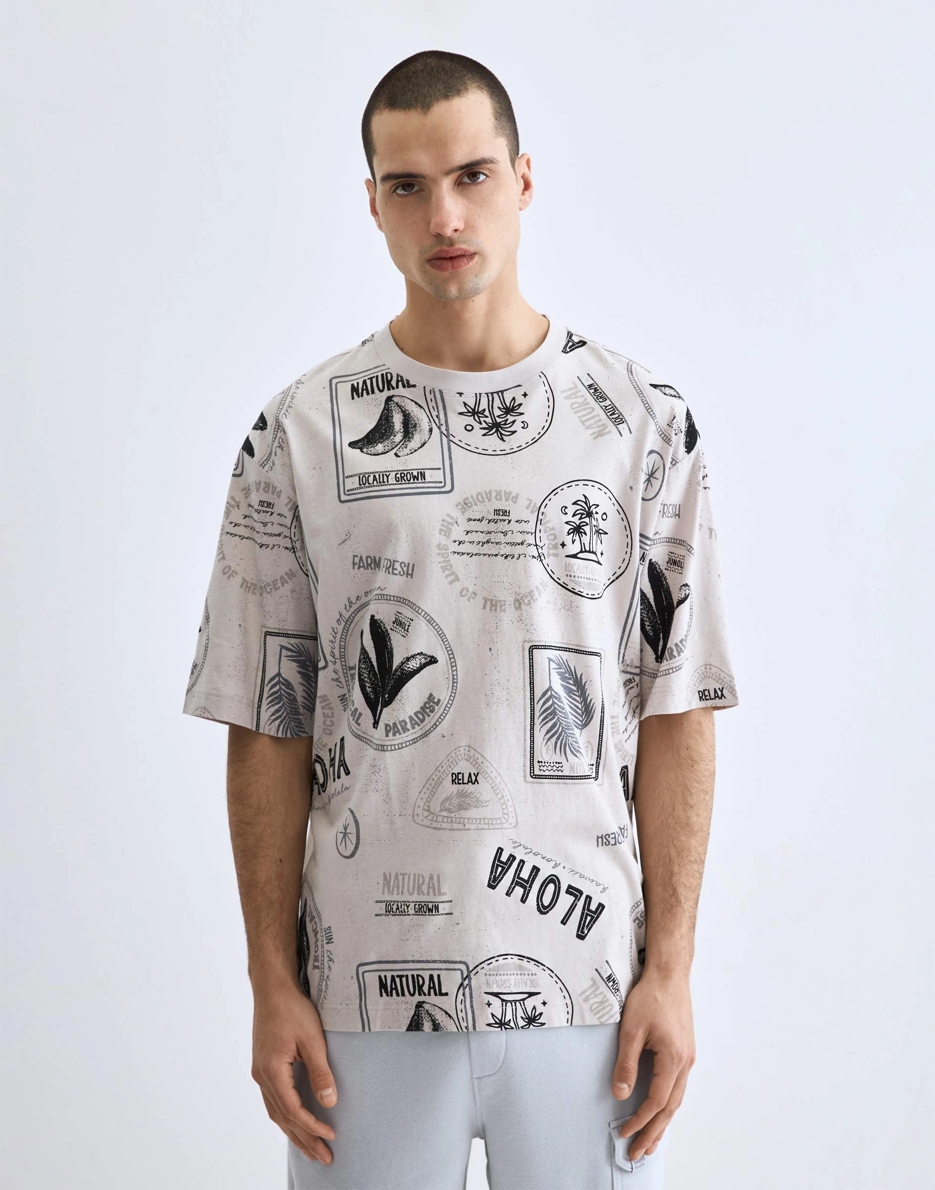 Светло-серая свободная футболка с тропическим принтом Bkt016803-1