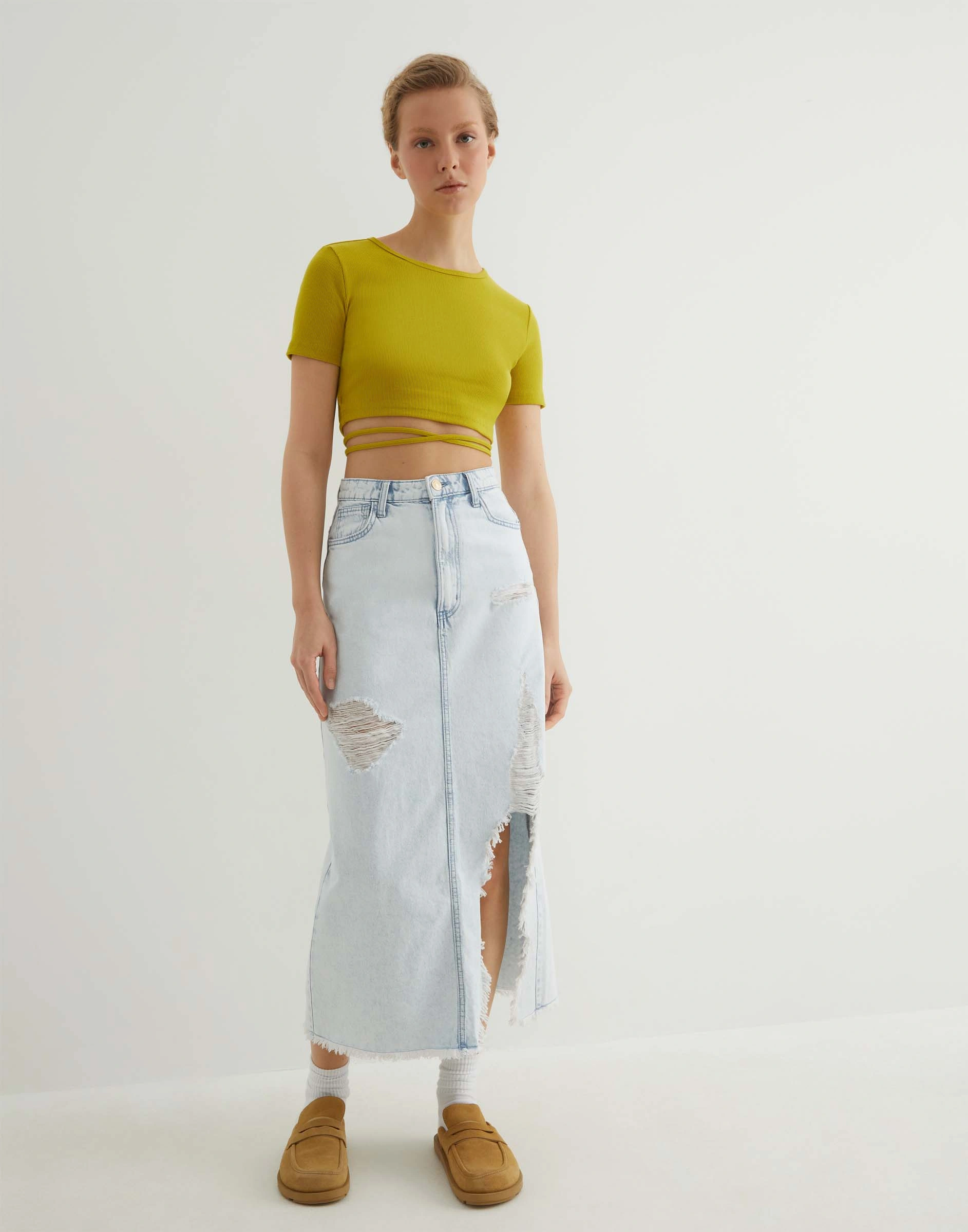 Джинсовая юбка с разрезом и дырами Gsk019656-2