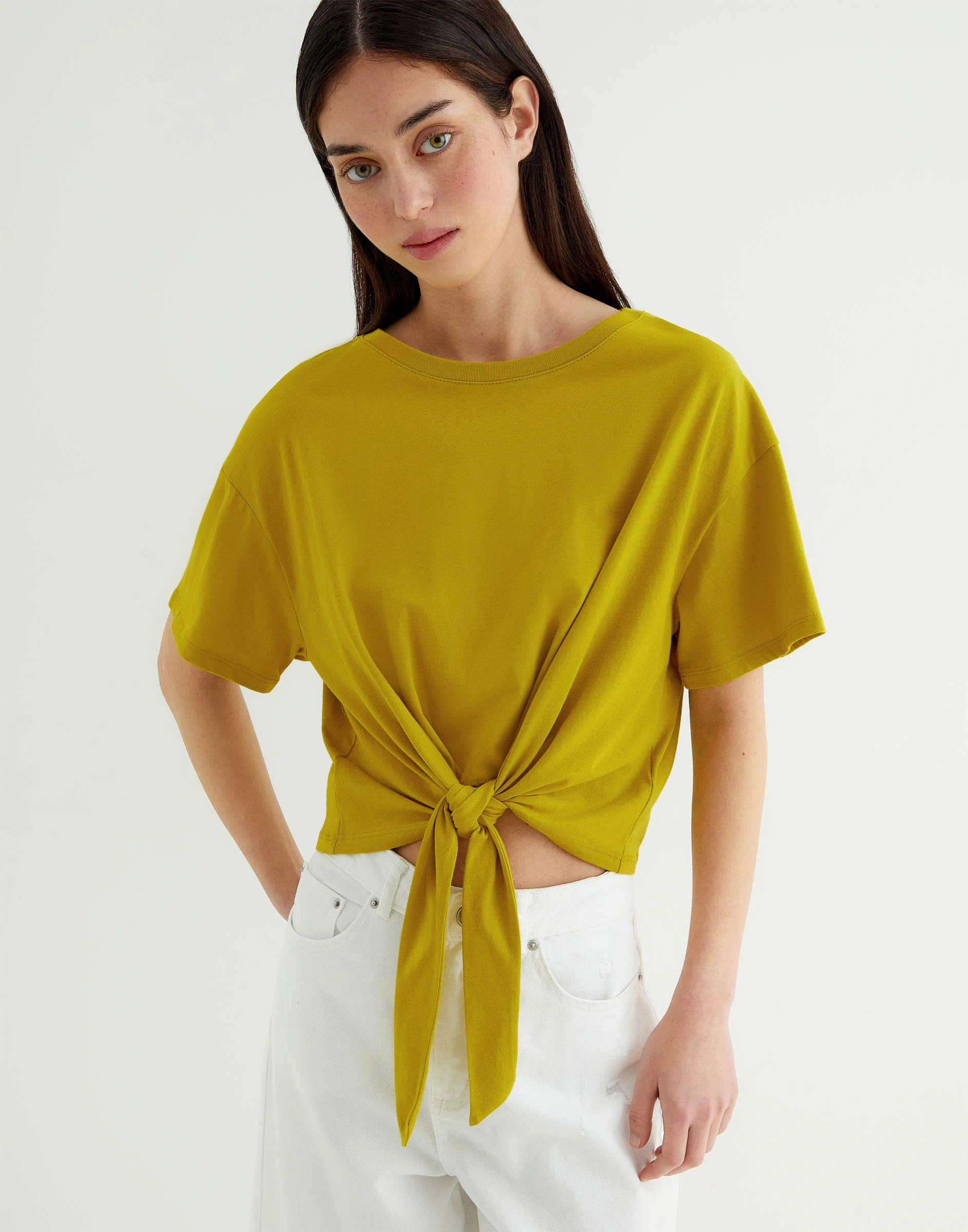 Зелёная укороченная футболка с узлом на талии Gkt026870-2