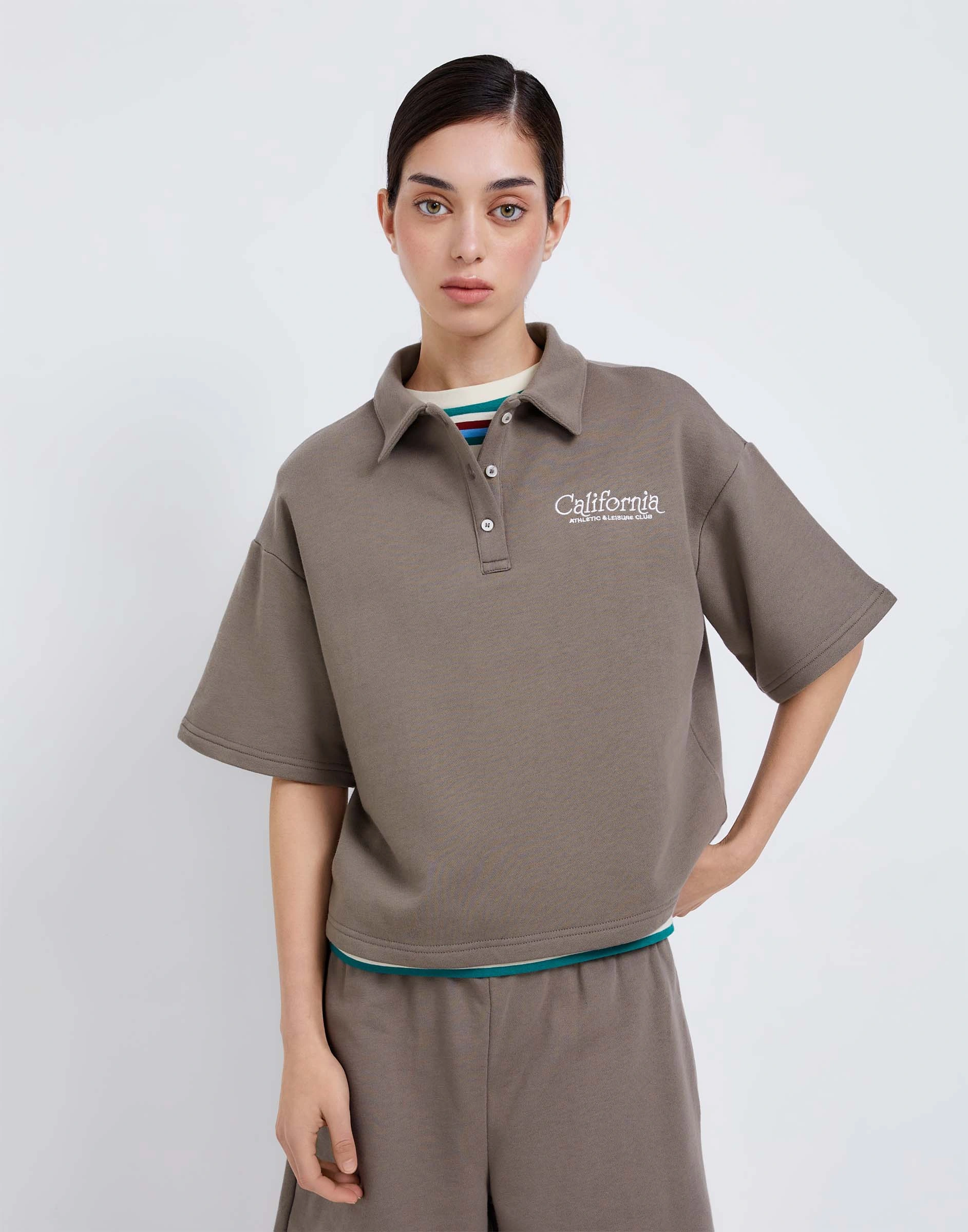 Коричневая спортивная футболка-поло oversize с вышивкой Gac024648-1