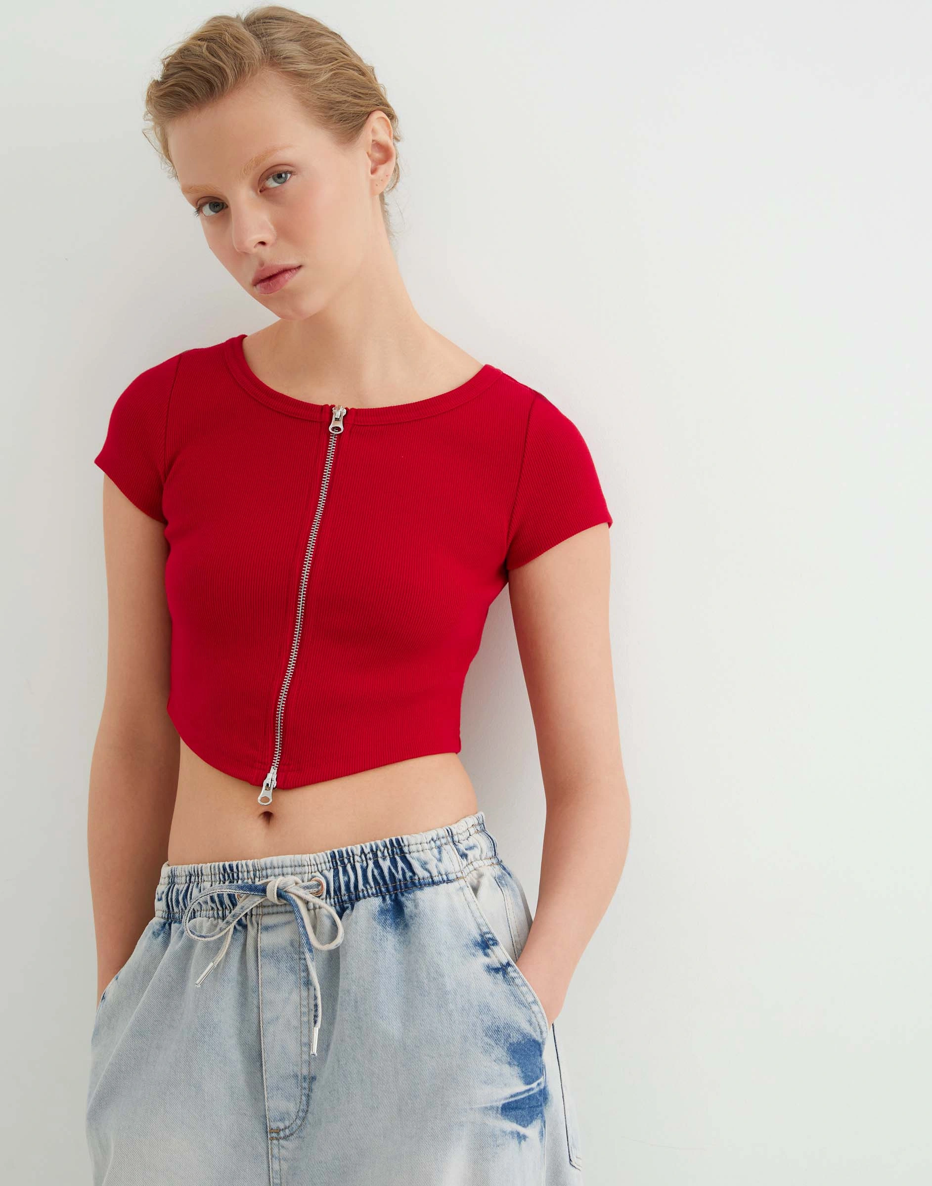 Красный кроп-топ с молнией и фигурным низом Gkt026830-2
