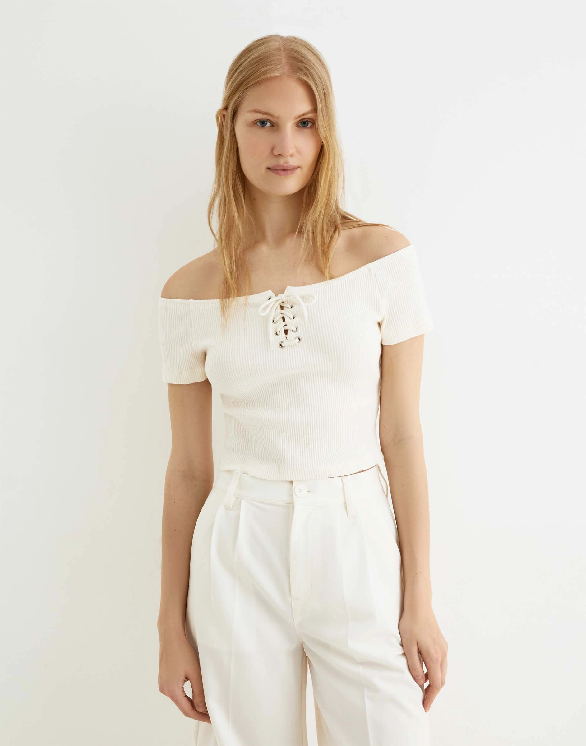 Молочный кроп-топ с открытыми плечами и шнуровкой Gkt026831-2