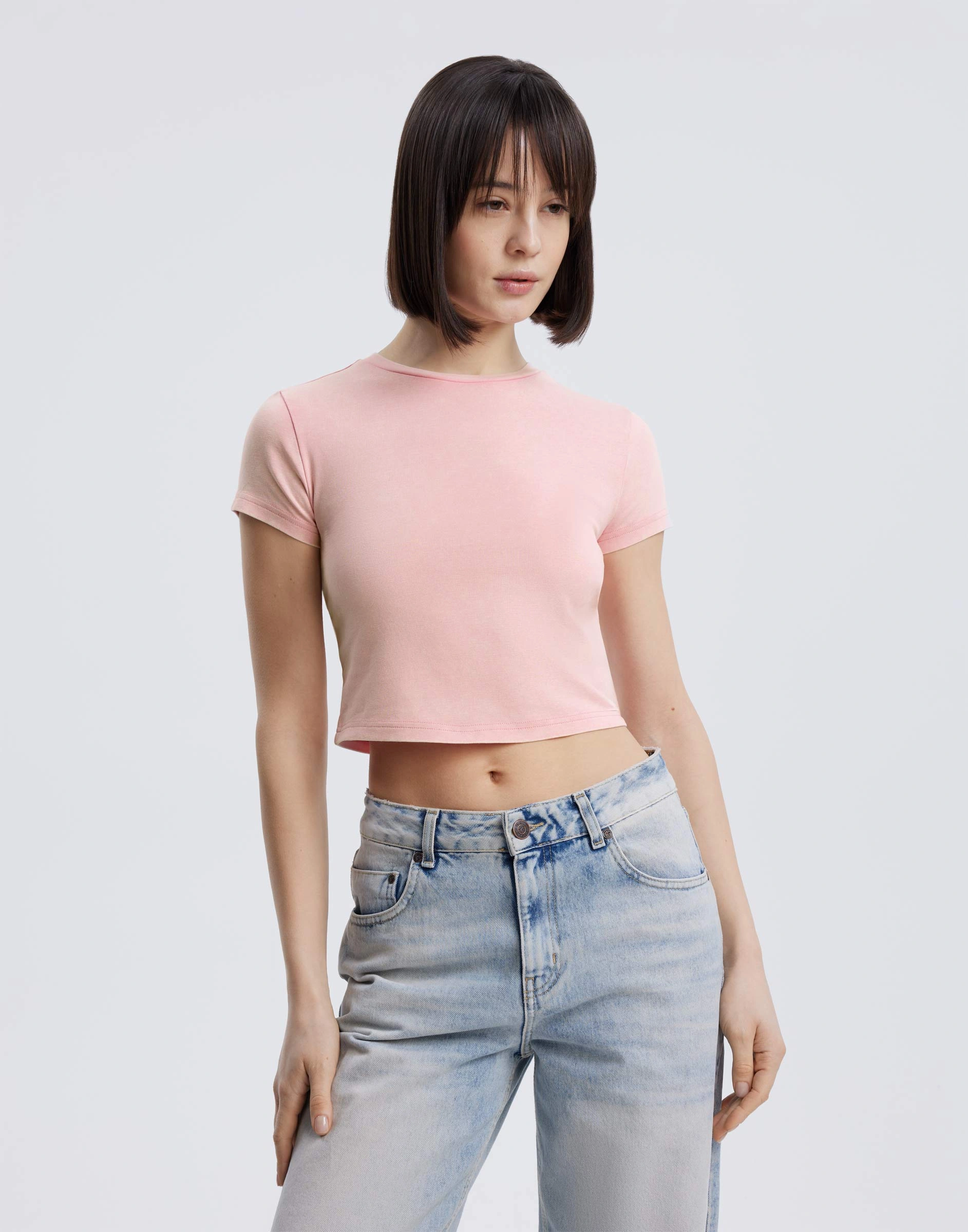 Пыльно-розовая укороченная футболка в рубчик Gkt026683-2