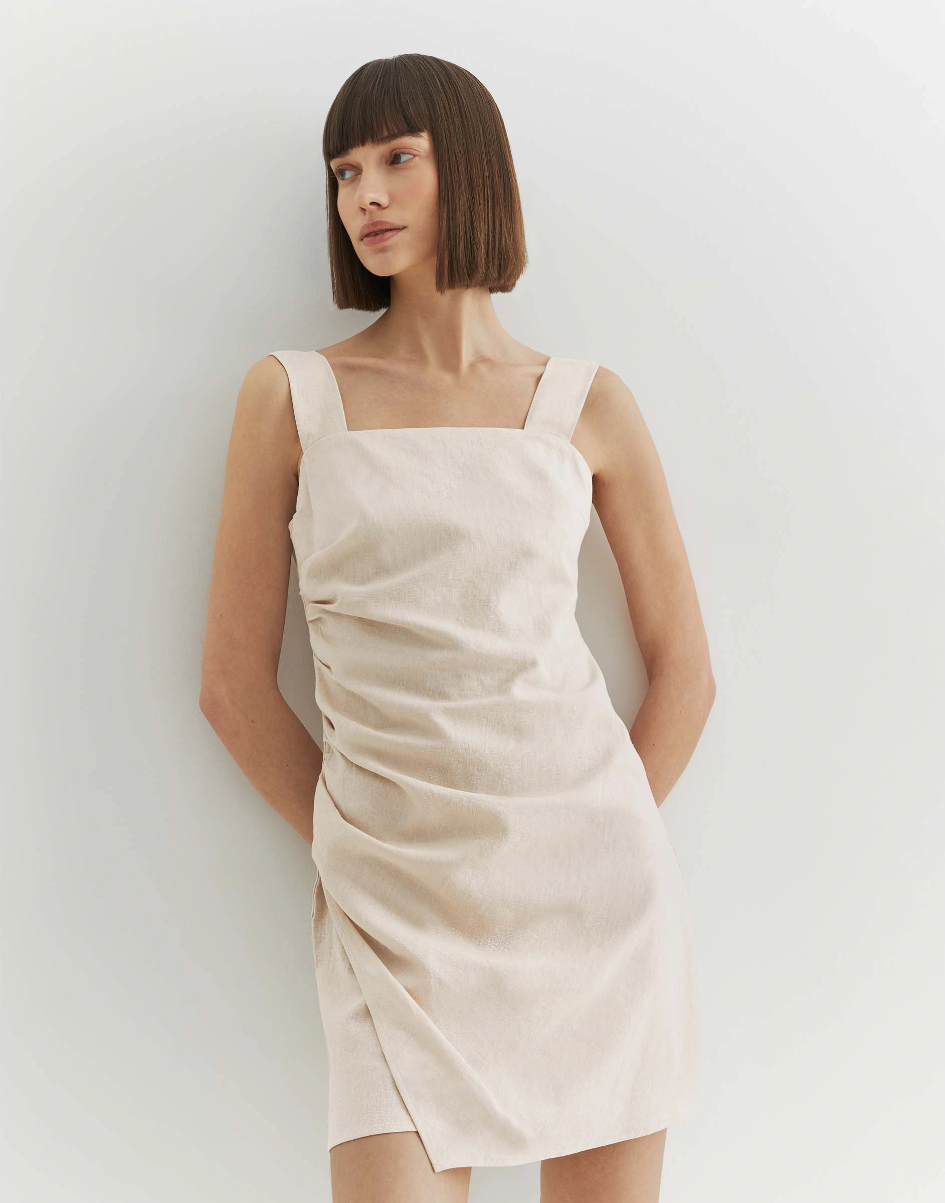 Светло-бежевое льняное мини-платье со сборкой и разрезом Gdr028440-4