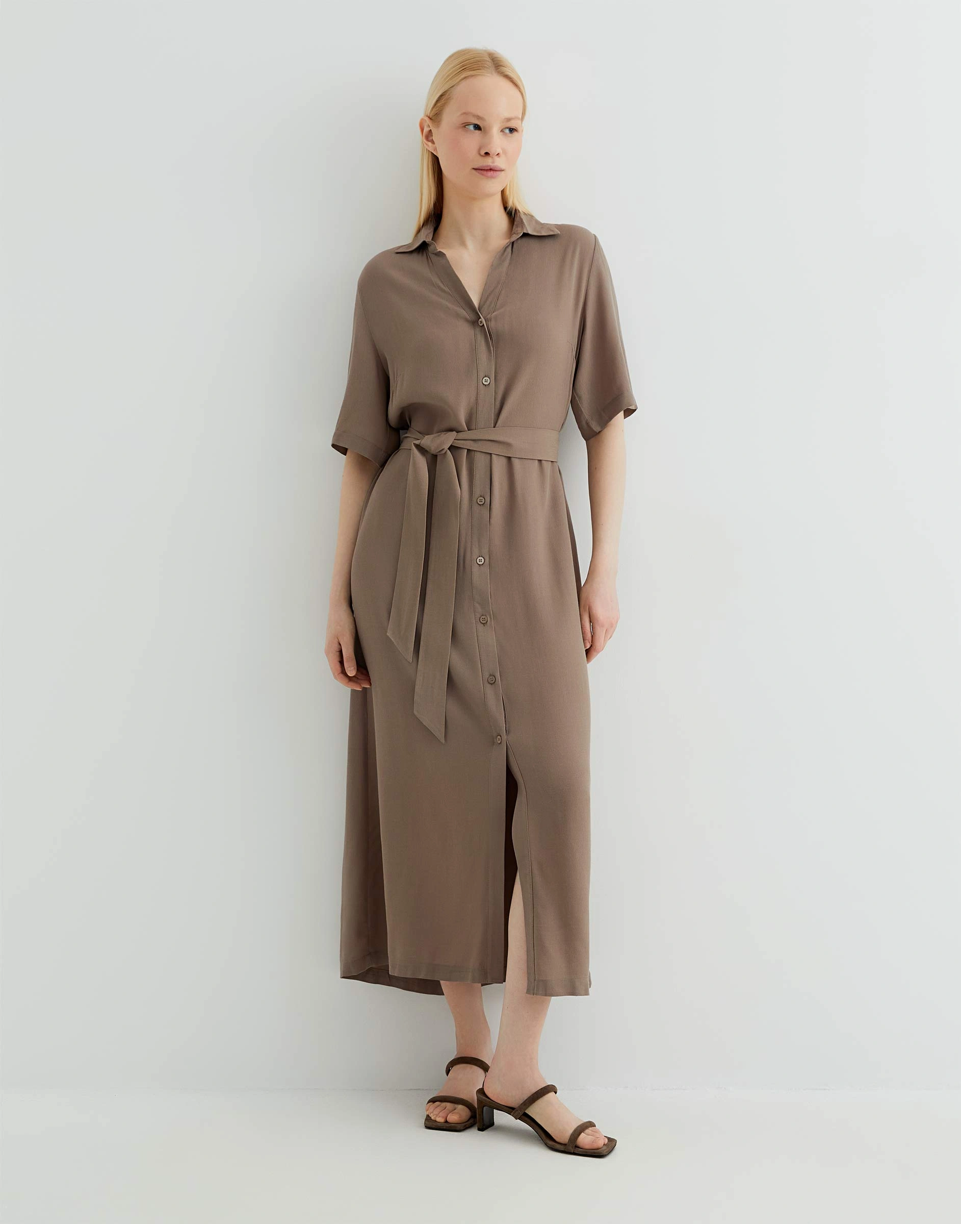 Светло-бежевое платье с поясом и короткими рукавами Gdr029662-1