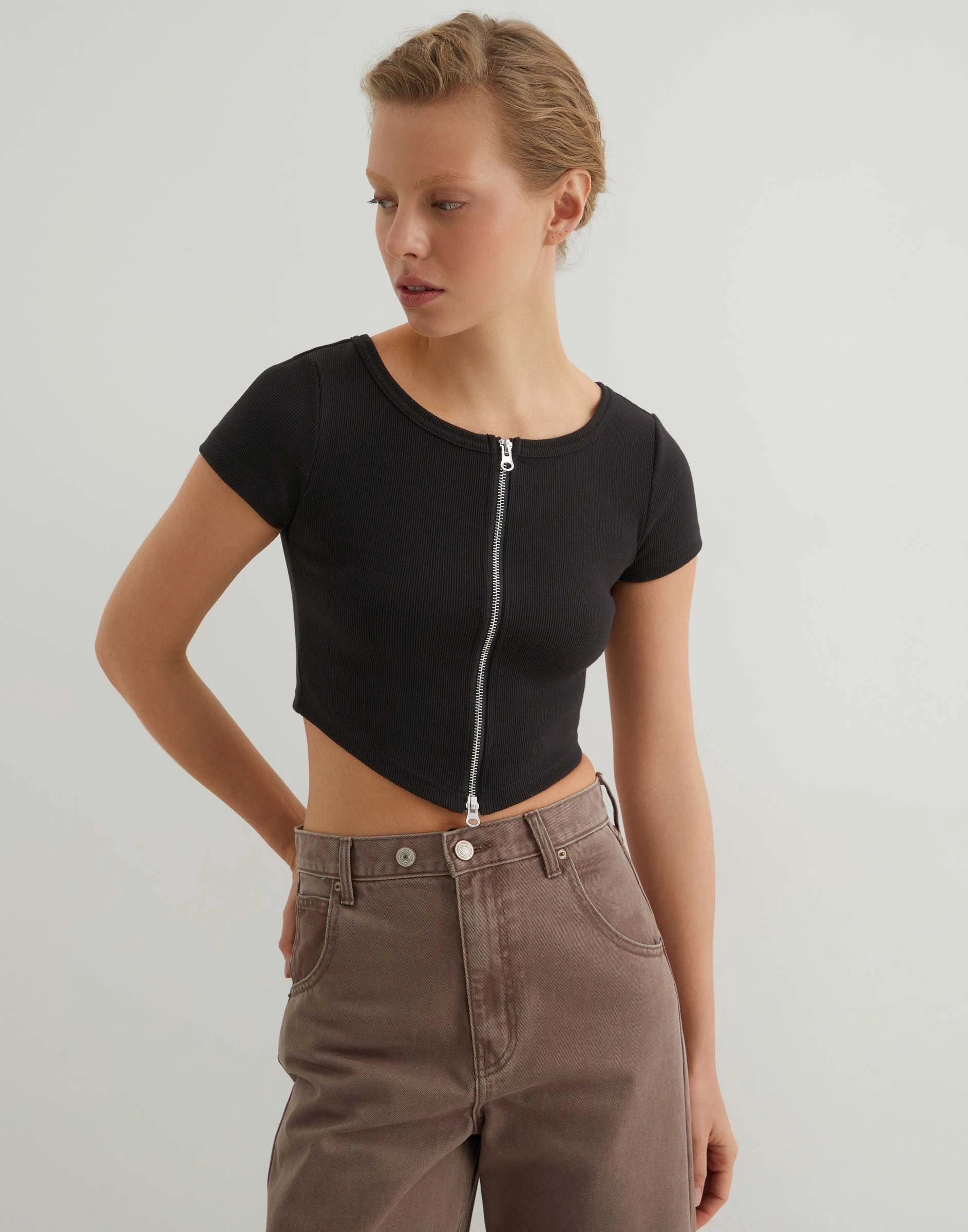 Чёрный кроп-топ с молнией и фигурным низом Gkt026830-3