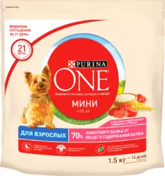 Корм сухой для взрослых собак Purina One Adult Говядина и рис, для мелких и карликовых пород, 1.5кг