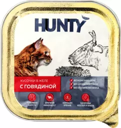 Корм консервированный для взрослых кошек Hunty с говядиной, кусочки в желе, 100г