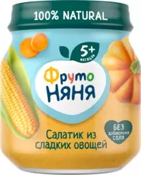 Пюре овощное Фрутоняня Салатик из сладких овощей, кукуруза, тыква и морковь, с 5 месяцев, 110г