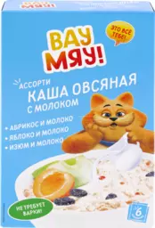Каша овсяная Вау Мяу Ассорти, молочная с абрикосом, молочная с яблоком, молочная с изюмом, 6х40г