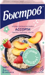 Хлопья овсяные Быстров Ассорти, с черникой, с клубникой и с персиком, 6х40г