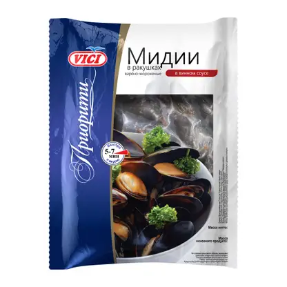 Мидии Vici в ракушках варено-мороженые в винном соусе 500г