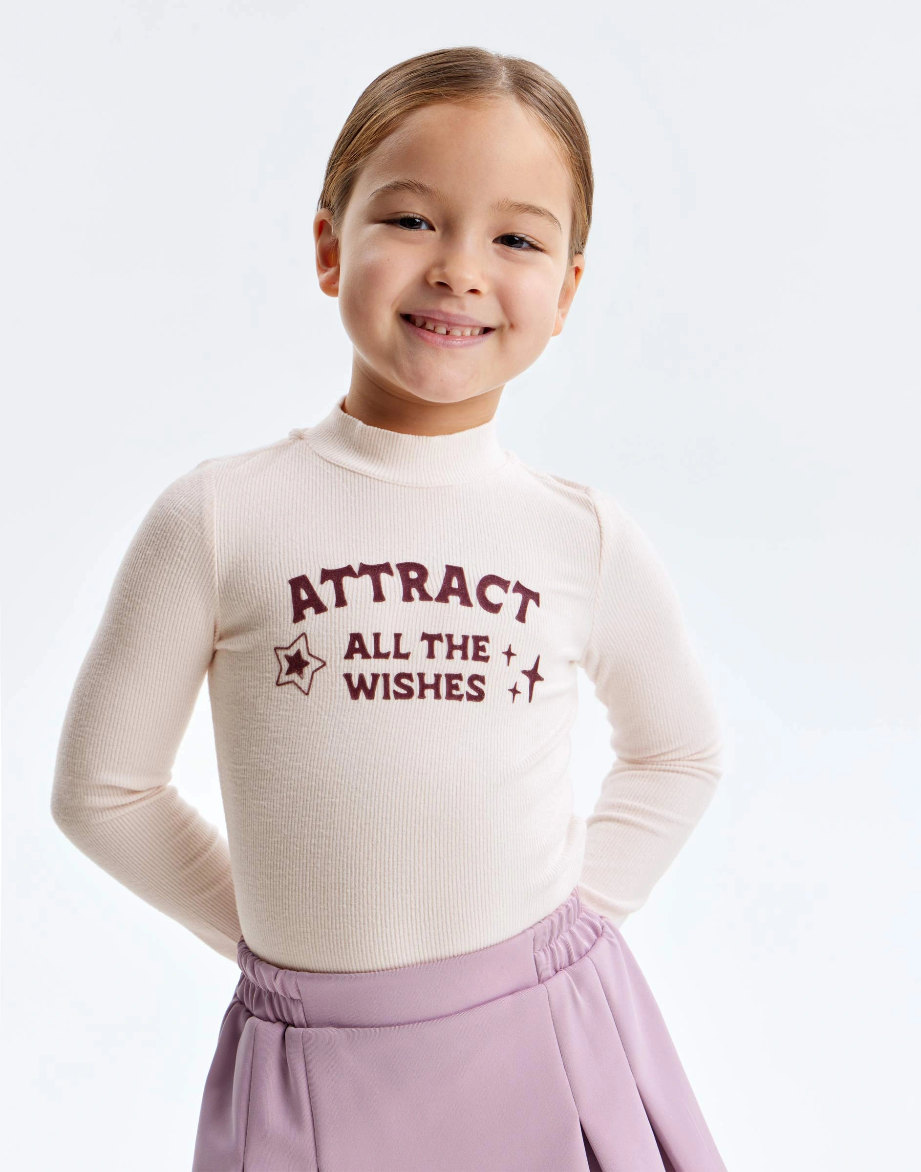Светло-бежевый лонгслив в рубчик с флок-принтом для девочки Gkt025945-1