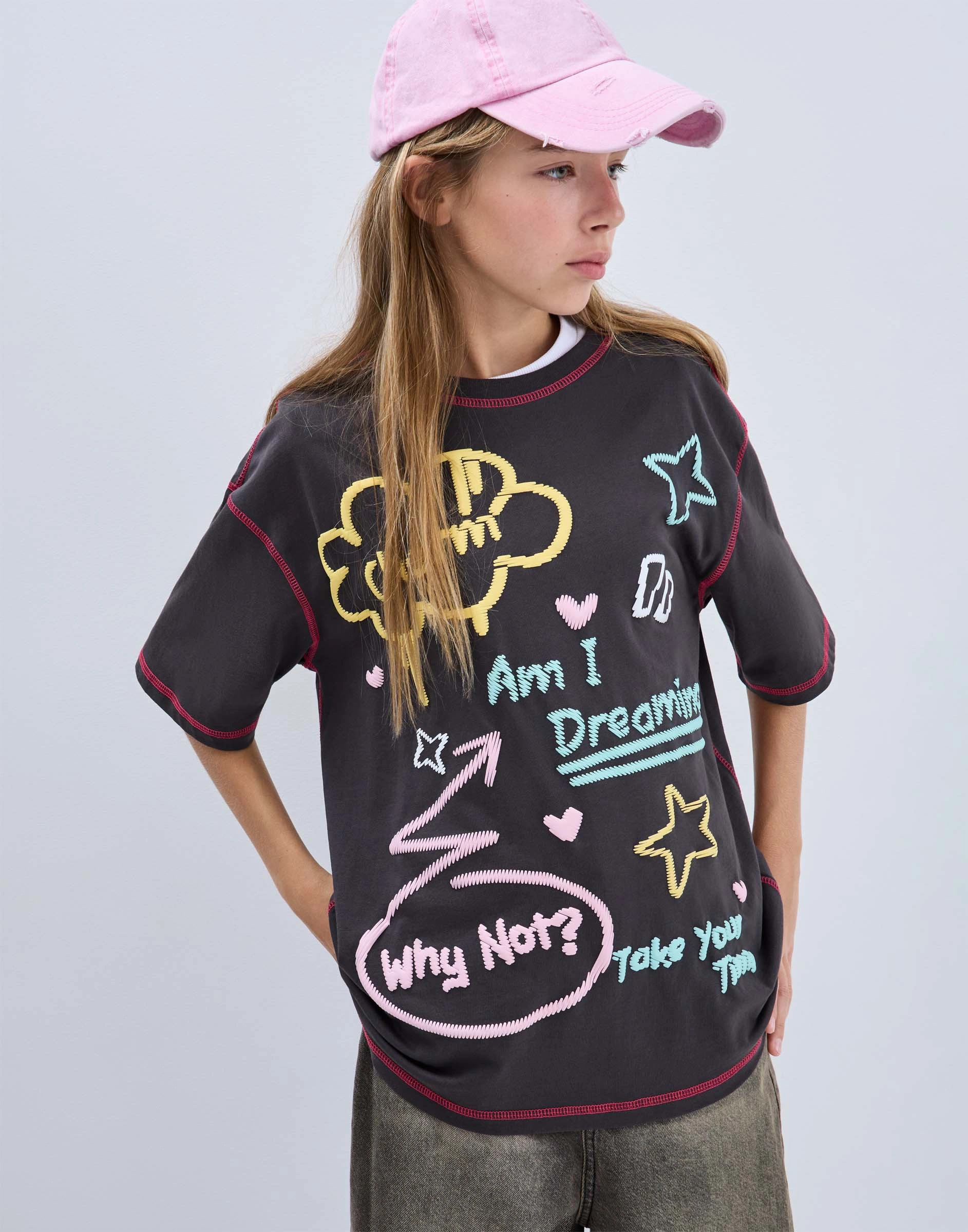 Тёмно-серая футболка superoversize с принтом и контрастными швами Gkt026769-2