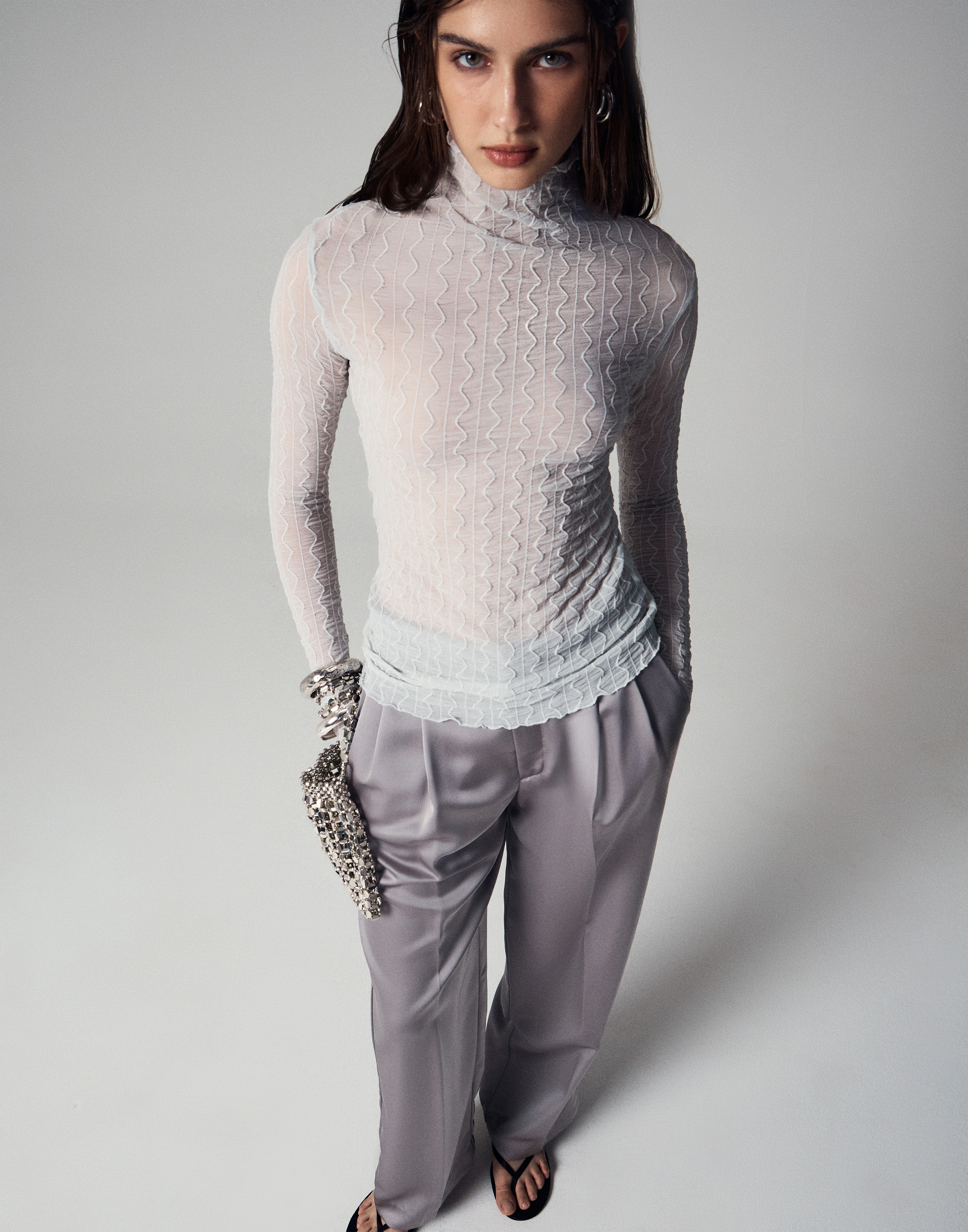 Светло-фиолетовый сетчатый лонгслив с воротником-стойкой Gkt022174-1