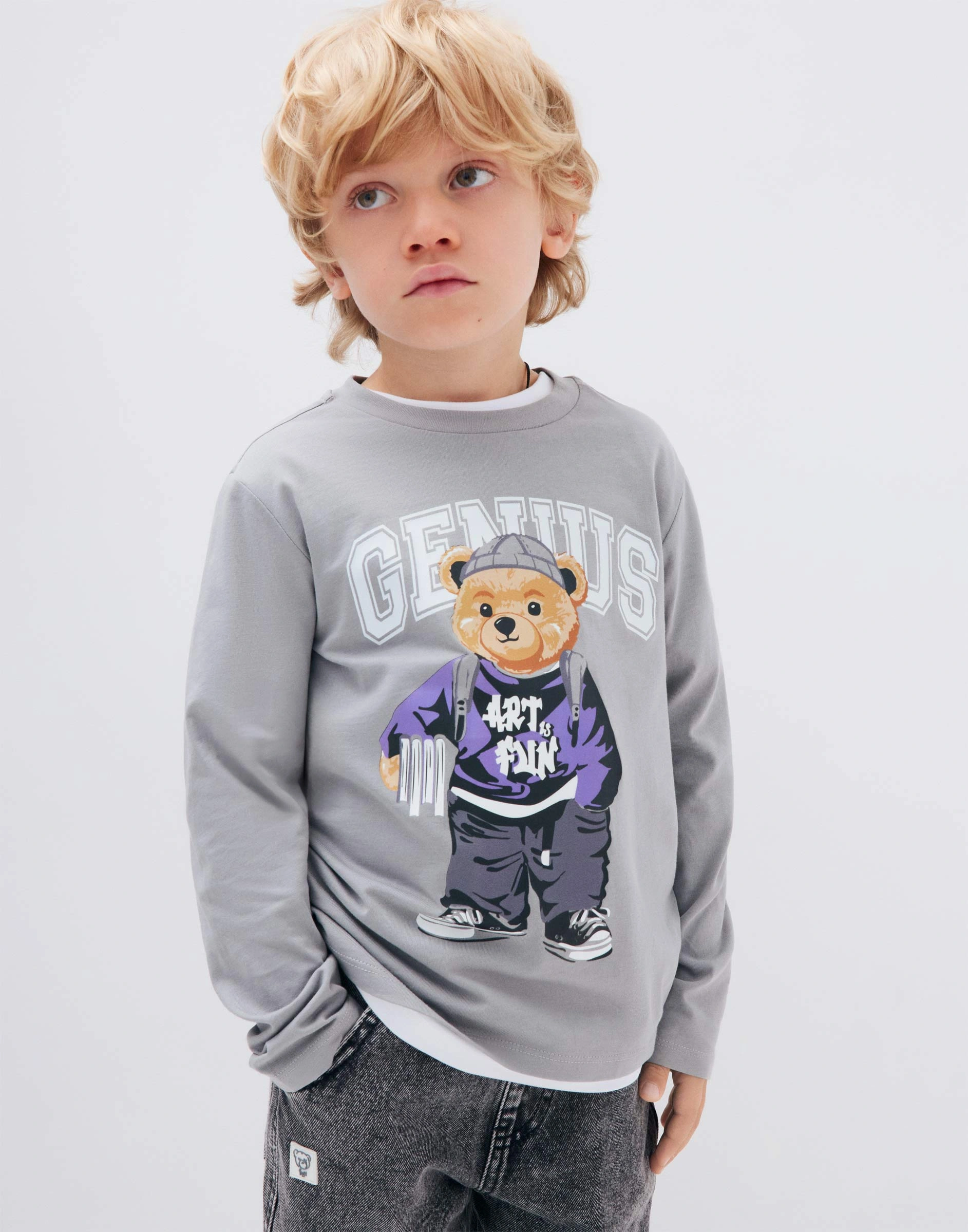 Серый лонгслив с медведем для мальчика Bkt017004-1