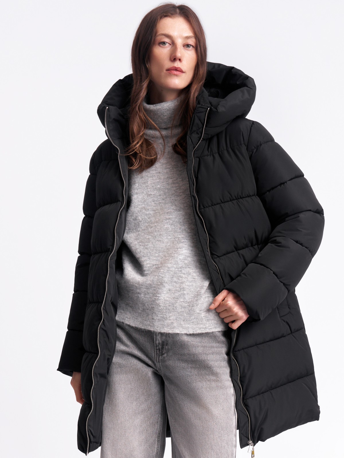 Тёплая стёганая куртка-пальто с капюшоном